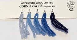 With crewel wool you can vary the number of strands you put through the needle. This depends on the stitch, but usually you use 3 strands for 12hpi. Because you can use more than one thread in the needle at a time you can mix colours in the needle for blending or interesting effects. Some kit designers use tapestry and crewel wool in the same kit for this reason.