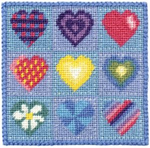 Eight little hearts and a strawberry. Each square is surrounded by an border of missed stitches giving an unusual quilted look.