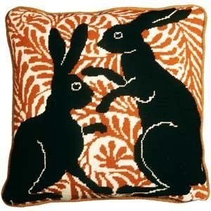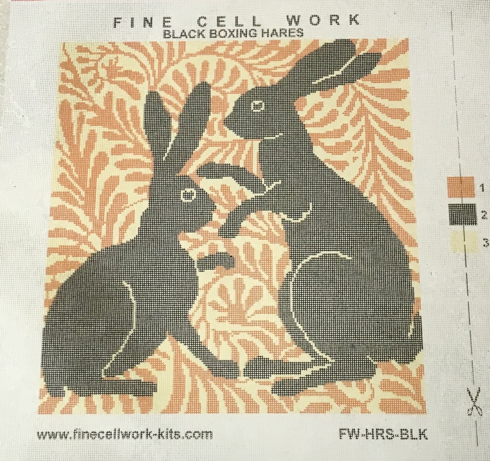 This striking design of boxing hares is available in three colourways. It is part of a series of needlepoint designs from Fine Cell Work inspired by Arts and Crafts ceramicist, William De Morgan. Worked in half cross stitch on 12hpi canvas, the finished piece will measure 16″x16″ (40.5cmx40.5cm).