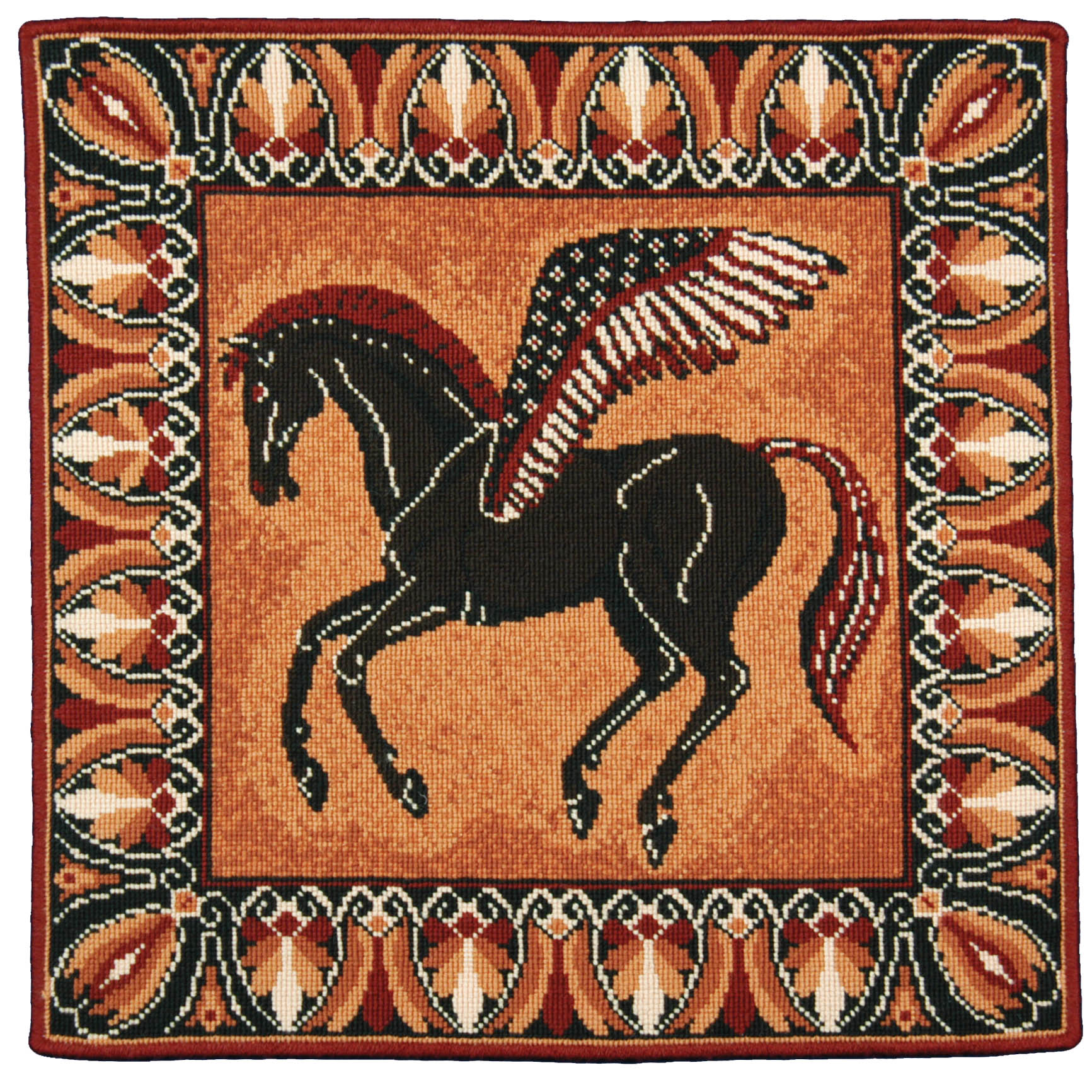 Pegasus in full flight. With its warm terra-cotta colours and strong border, this Animal Fayre needlepoint design is evocative of ancient Rome. Worked in Victorian cross-stitch on 10hpi canvas, the finished piece will measure 21″x21″, 53x53cm.