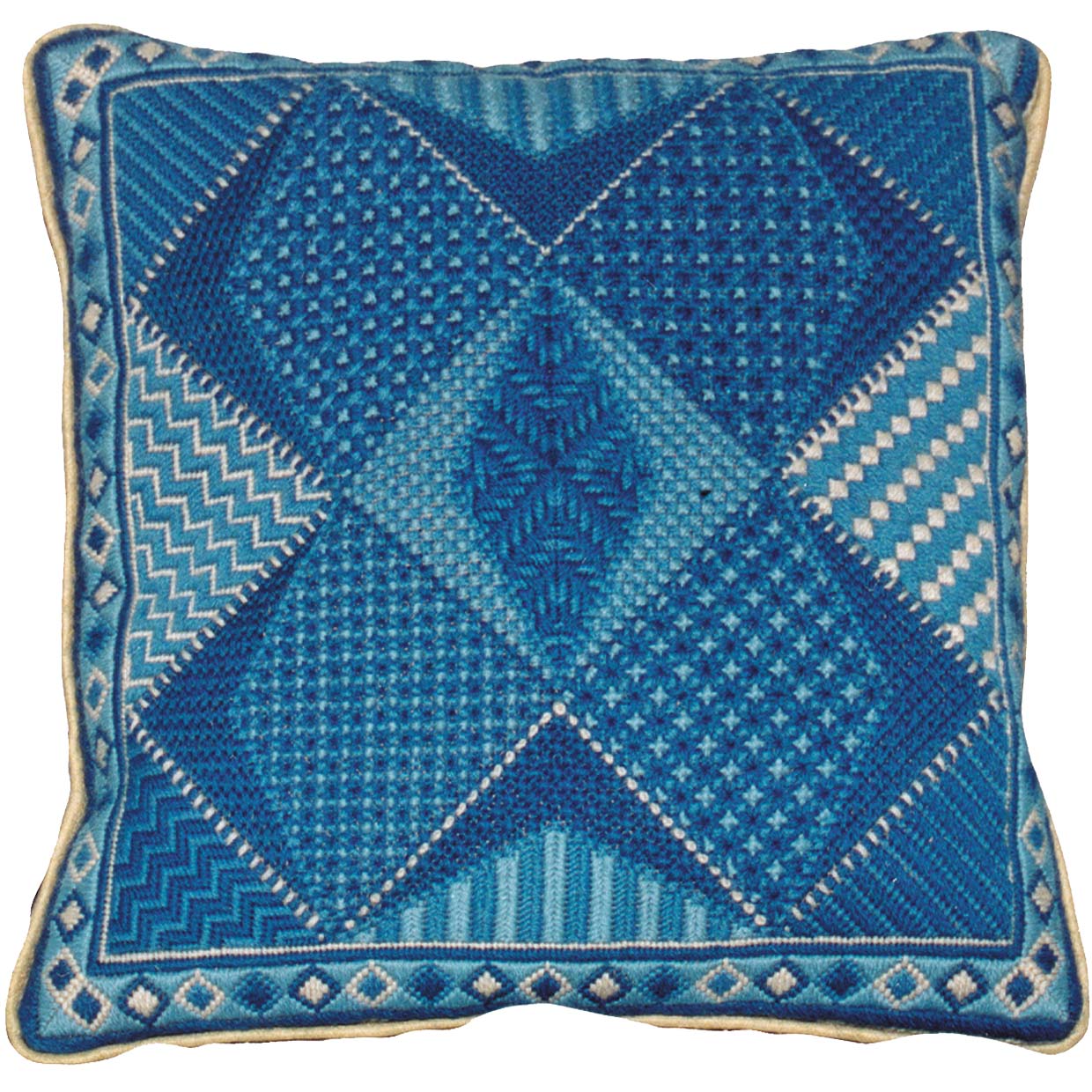 A sampler made up of triangles and diamonds as opposed to the more traditional squares. This design is worked in Appleton Crewel wool on 14hpi canvas. It uses 24 different stitches. The finished piece is 13″x13″, 33x33cm.