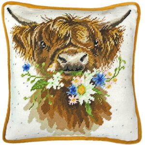 A highland cow happily munching flowers! This needlepoint design is from Bothy Threads and is worked in half cross-stitch on 10hpi canvas, the finished piece will measure 14″x14″, 36x36cm.