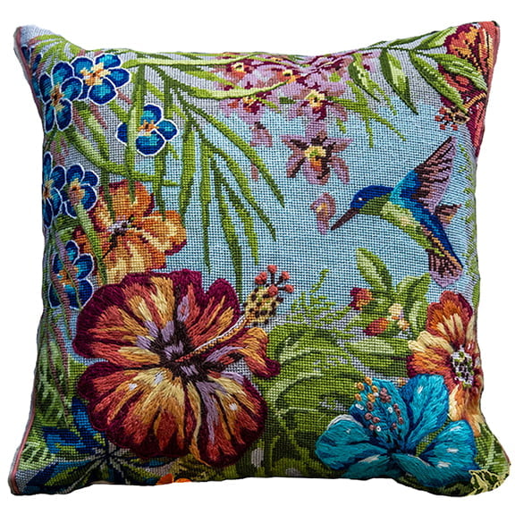 This design of tropical flowers with a gorgeous humming bird was inspired by vintage books of botanical prints in The British Library. It goes particularly well with Butterflies. This kit is worked on 12hpi, the finished piece will measure 16.5″x16.5″, 42x42cm. The sample is mainly worked in tent stitch with a selection of other stitches to give the finished piece a more textured feel. Instructions ae given for all the stitches, but the cushion can be stitched completely in tent stitch if you prefer.