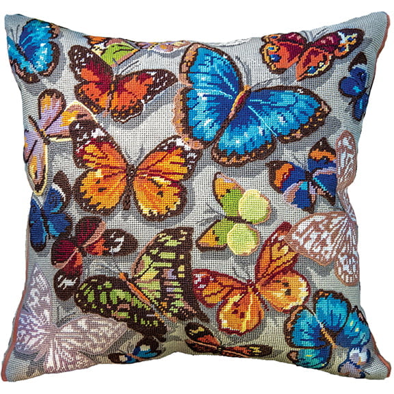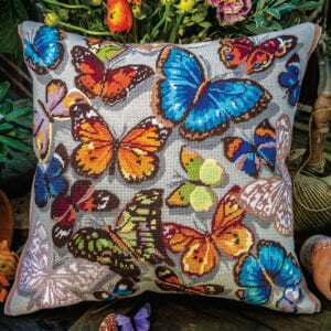 Lovely bright butterflies. This design goes particularly well with Tropical. This kit is worked on 12hpi, the finished piece will measure 16.5″x16.5″, 42x42cm. The sample is mainly worked in tent stitch with a selection of other stitches to give the finished piece a more textured feel. Instructions ae given for all the stitches, but the cushion can be stitched completely in tent stitch if you prefer.