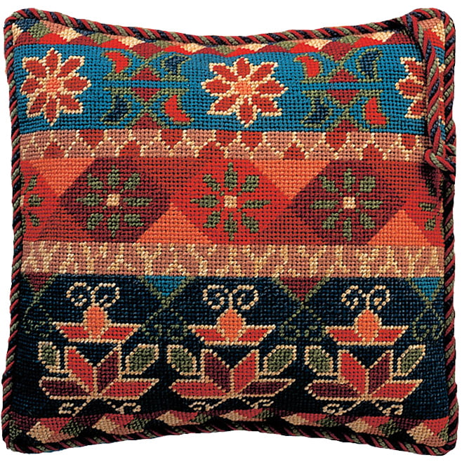 The kit is stitched in simple tent stitch using the wool double. Sometimes the wool is shaded to give a beautiful woven effect. It is worked on 7hpi, the finished piece will measure 15″x15″, 38x38cm. The sample is worked in tent stitch.